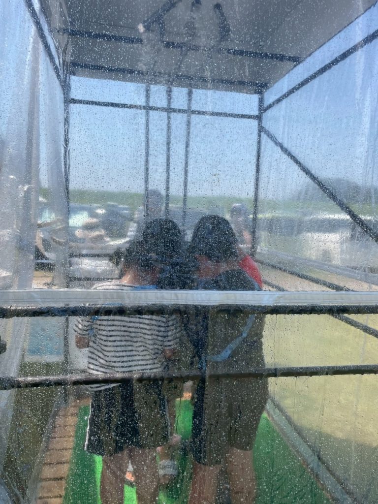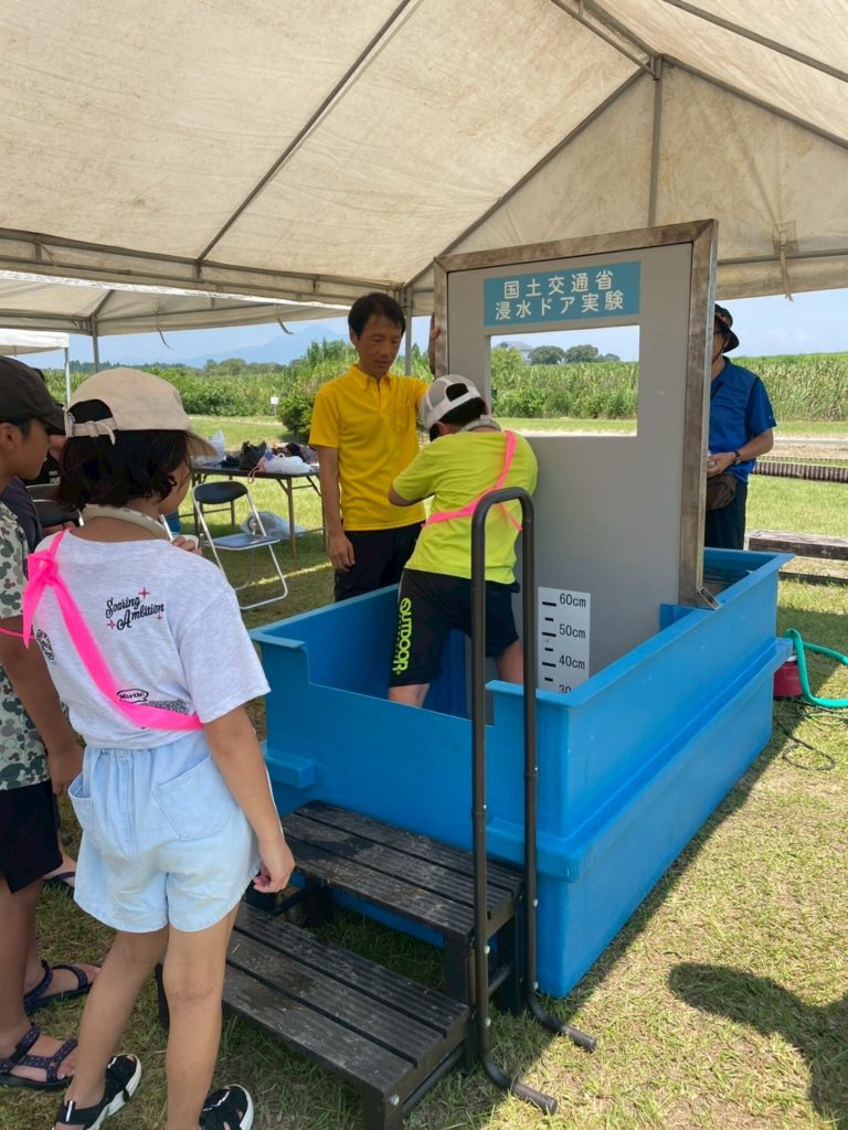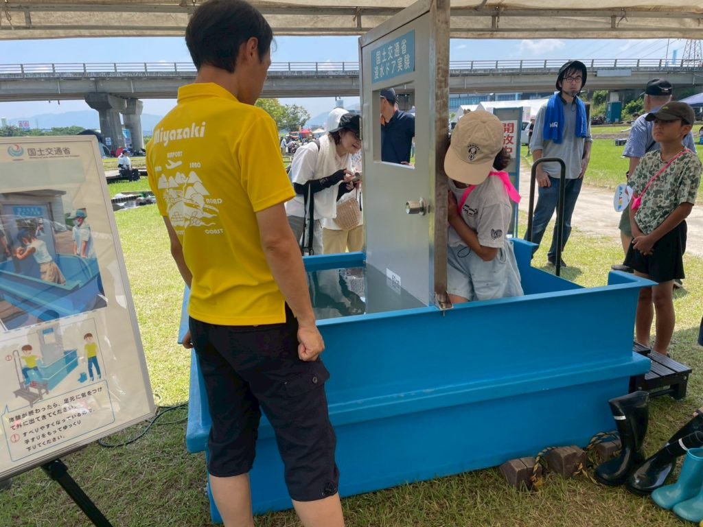 まずは、国交省:水圧でドアが開かなくなる体験ブースと、降雨体験機を使った豪雨の体験コーナー。