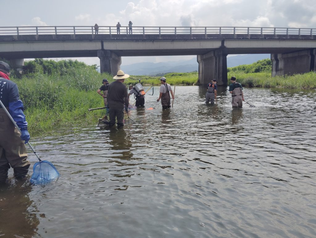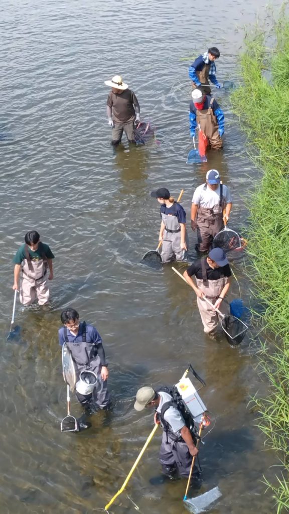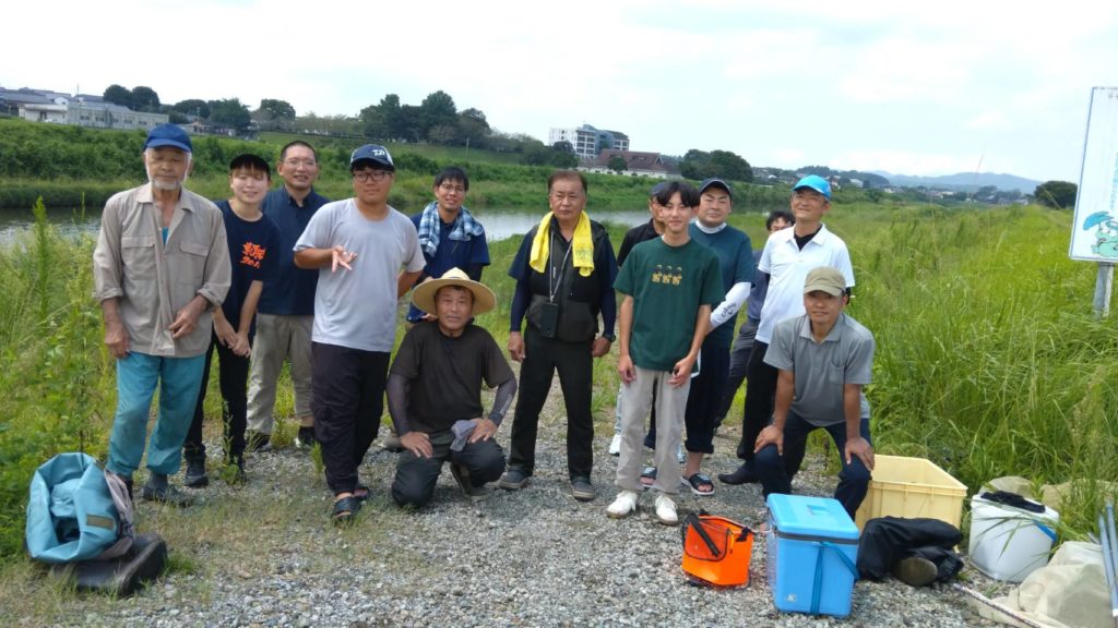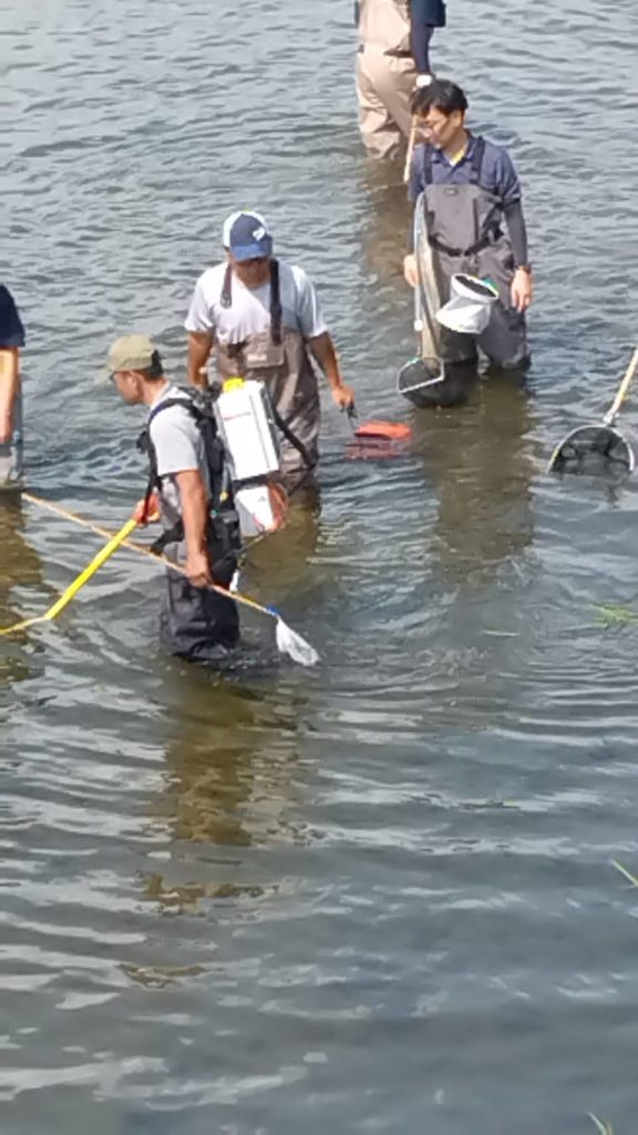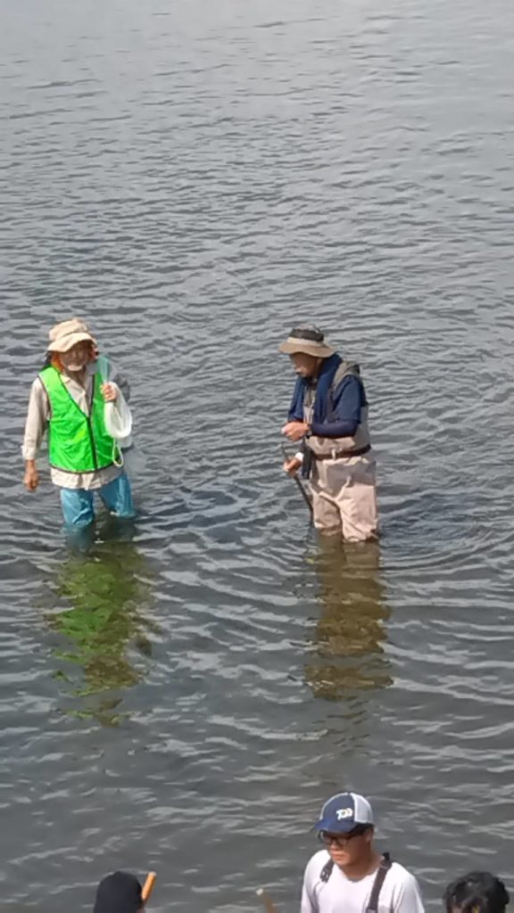 今回の捕獲手段は、「電気ショッカー」をメインに、釣り(ルアー)・投網で実施されました。                     宮崎県水産試験場 内水面支場の「田口 支場長」が操作される“電気ショッカー”を先頭に、まるで🐟大学病院の「教授回診」の様な光景でゾロゾロと⚡金魚の糞のごとく・・・😅💦(笑)