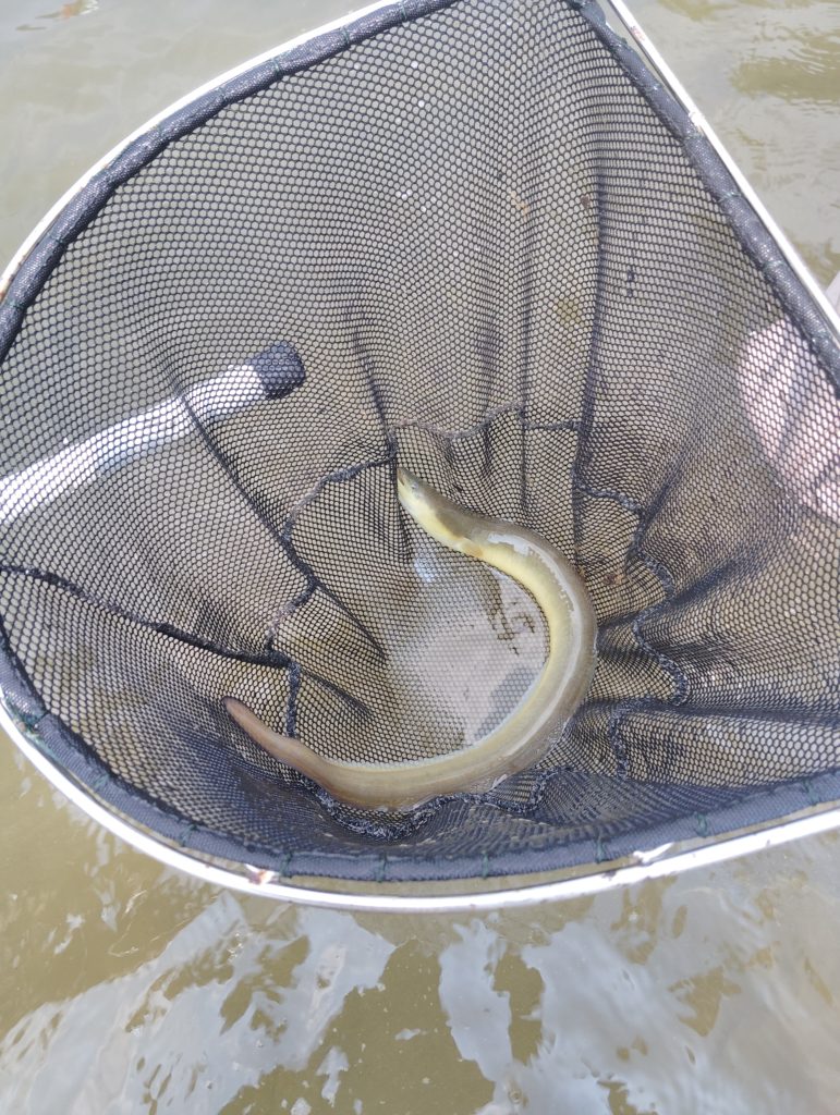 電気に反応したコウライオヤニラミ🐟は、エラを開いた状態で“失神”するので⚡浮き上がったところをタモ網ですくいます。                                                     時には、こんな魚も獲れました👌・・・しばらくすると、泳ぎだしましたのでリリースしました💧
