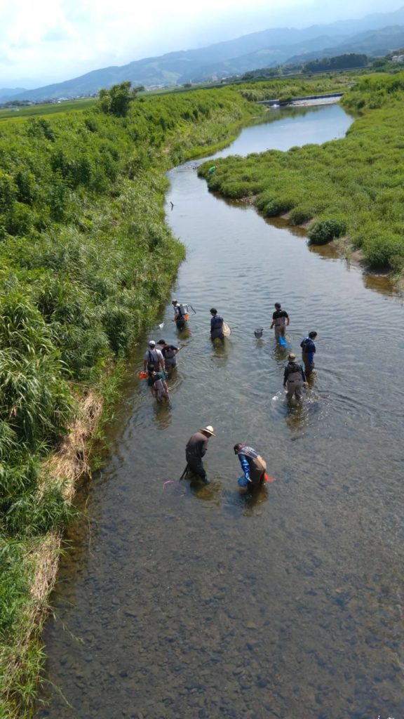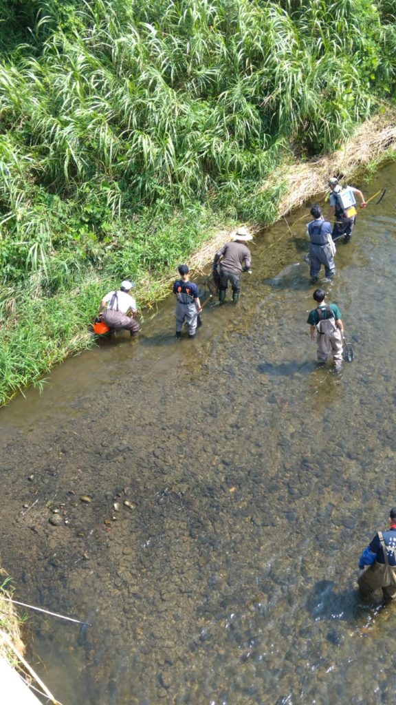 去る8月22日(金)「外来魚コウライオヤニラミ捕獲作戦」第三弾として、宮崎県水産試験場さんの「県水産試験場内水面支場コウライオヤニラミ調査」に同行させて頂く形で、都城市・南九州大学・都城漁協(ご有志組)・サミット「官 学 民」15~6名の捕獲活動となりました。                                            今回は、捕獲場所(川)を2017年に最初に発見された「萩原川」で実施しました。