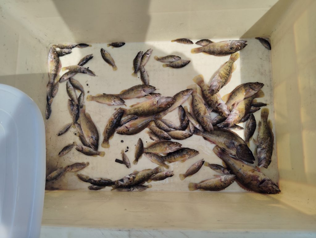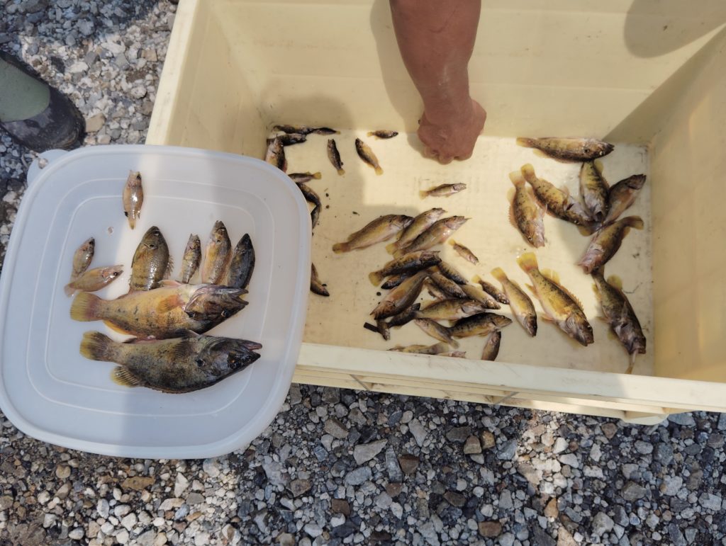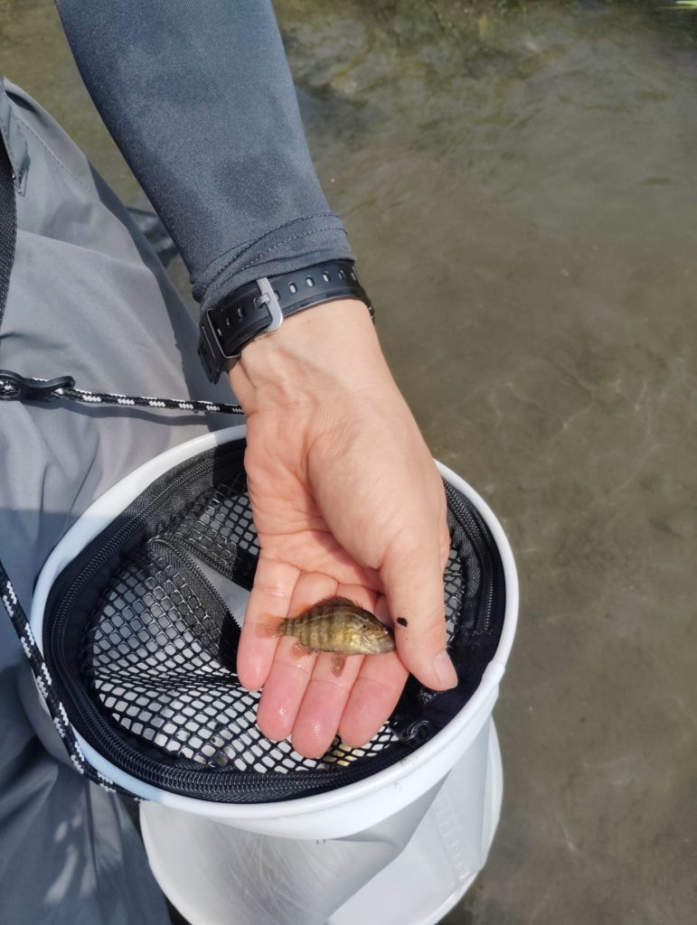 小一時間ほど🐟捕獲を続けると、なな!なんと120匹が捕獲され、その中で「オヤニラミ(以前より居る)」は4匹と  いかに、コウライオヤニラミの繁殖力が凄いかです😲💦・・・小さい物は🐟今年生まれた物らしいです。