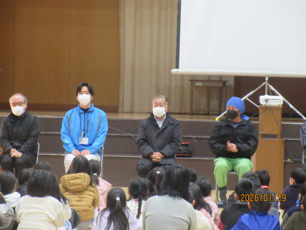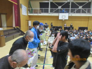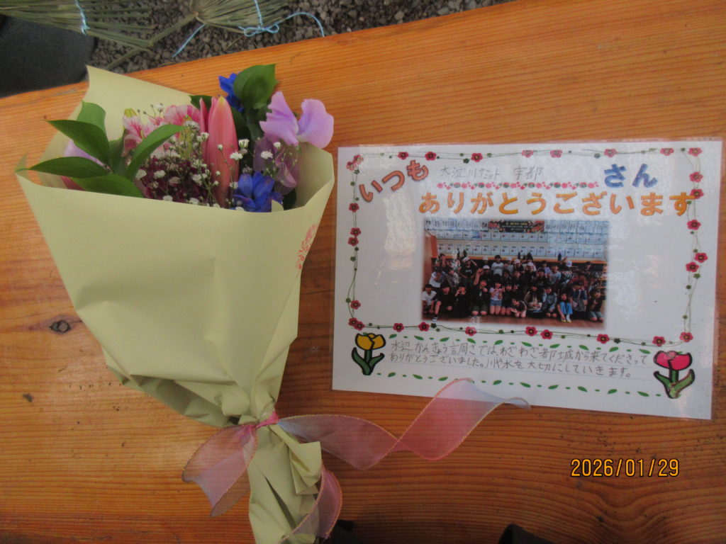 「先生以外でも、沢山の地域の方に教え・援助を受けたお陰で皆さんは、学校生活が送れています・・・感謝しましょう」と校長先生のお話しの後、それぞれの学年の代表より対象者に感謝状・花束が贈られました。